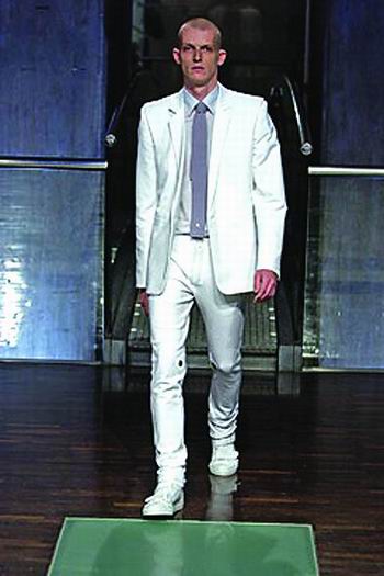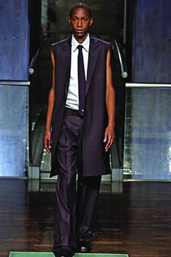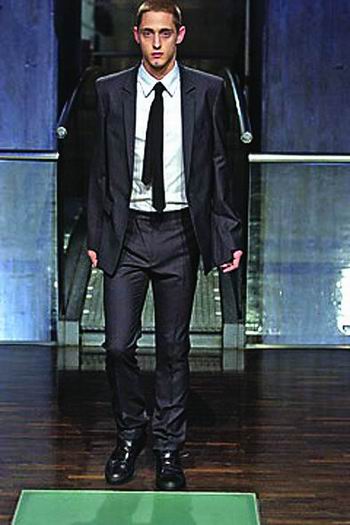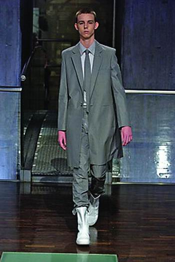 拉夫.西蒙一开场就推出了久负盛名的修身套装,这几乎已经成为他十几年设计生涯中的标志性风格。同时也成就了Dior男装设计师海迪斯利曼尼的声名。整场展示,西蒙准确的表达了未来男装的发展趋势。模特们在现场搭建的升降梯上优雅的行走,伴随着Vangelis的音乐,营造出一种庄严肃穆的气氛。丝质衬衫,搭配装饰着冰白色皮革材质的长裤,像是来自另一个世界的服饰。同时模特脚穿大号运动鞋,更有一种古怪精灵的星球大战和太空计划色彩。T恤紧身皮质束腰外衣,或是在套装外罩上白色尼龙雨衣,拉夫.西蒙正在探索下一个时尚浪潮的关键因素。