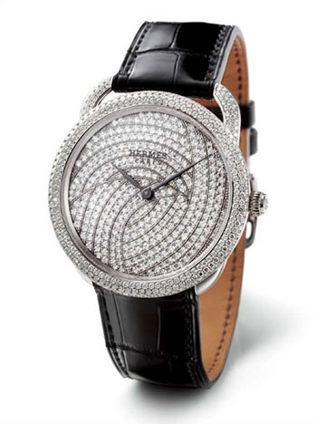 18K白金在41mm表壳上方伸延出马镫型的不对称式表耳,象征对品牌与马术的不解之缘;表款上镶上312颗VVS等级天然美钻,共重2.6 克拉。而表盘上则以331颗闪烁美钻密镶,并排列出羽毛般的图案,优雅尊贵醉心迷人。此外,表带部分可以选购多款不同颜色的爱马仕皮质表带,全部以工匠所创的“马鞍针步缝制法”手工缝制, 质感当然不在话下。目前已为台湾市场分配了11枚尊贵腕表,而大陆市场的钟表收藏家需要耐心等待了。