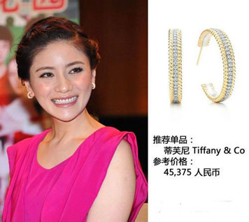 胡可一副碎钻耳环优雅迷人,金色搭配钻石显露小女人摸样,不夸张的外形适合大多职场女性。