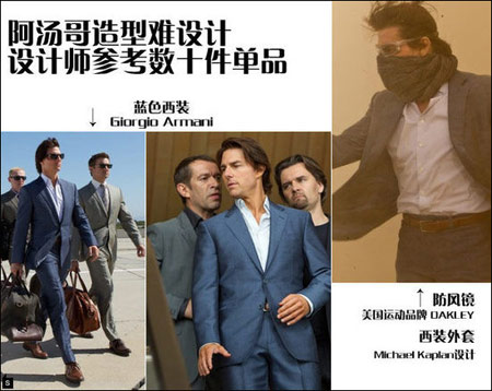 一身来自Giorgio Armani的蓝色西装让文质彬彬的阿汤哥更添斯文,而笔挺的线条将阿汤哥的身姿也勾勒的更加挺拔。有了OAKLEY的防风镜和Michael Kaplan设计的西装外套上身,阿汤哥在剧中的形象也被塑造的更加逼真。除了时尚服饰,“碟4”中手机、电脑的植入亮相也让大家在看剧的同时,过了一把辨识“品牌”瘾。