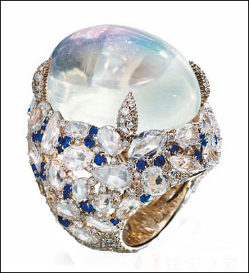 Pomellato Pom Pom 系列,硕大的月光石戒面仿似氤氲着诱人的荔枝清香,浮于小颗月光石和蓝宝石之上,折射出的数道幽蓝光芒穿过大颗月光石,打造出夜晚深邃的星空。