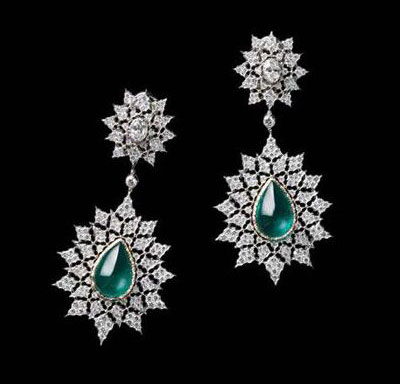 蕾丝雪花状的新娘耳环,将新娘的耳间衬托的更加具有迷人的光彩,小颗粒钻石镶嵌成花朵形状,椭圆形的绿色宝石将让这款新娘戒指增加了奢华感。