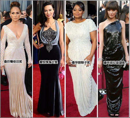 美丑两级分 搞怪创意博眼球“奥斯卡红毯颁奖”继续……最巨臀依旧奖:詹妮弗-洛佩兹穿着Zuhair Murad条纹礼服把丰盈的身材勾勒得更加粗壮。最惊悚鬼片奖:邓文迪穿着黑色天鹅绒拼接礼服陪同李冰冰亮相奥斯卡。不过身材早已走形,脸部僵硬的她,像足了早期香港鬼片中的主角,死气沉沉没有生命力。最华丽粽子奖:捧得最佳女配角奖的奥克塔维亚-斯宾瑟穿着Tadashi Shoji白裙亮相,这位胖影后虽说在表演上获得了肯定,但可惜穿着上还得大大提高,华丽丽的镶片白裙愣是被她撑得变了型……