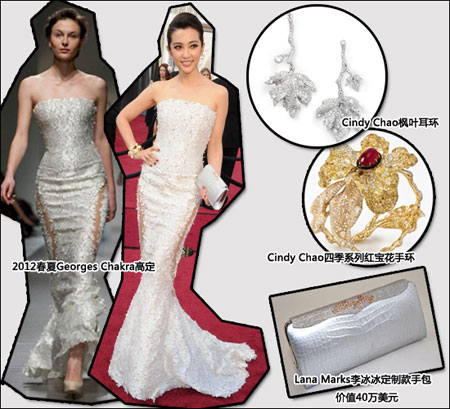 李冰冰身着2012春夏Georges Chakra高级订制礼服亮相奥斯卡红毯。这款礼服就像用纸做的一样,不足1两重。这是李冰冰继去年戛纳“天鹅湖”之后,再次穿着这位黎巴嫩设计师设计的礼服,优雅中透露着性感。珠宝方面,李冰冰戴着Cindy Chao四季系列红宝花手环,该手环共由超过3019颗、超过70克拉的钻石及彩色钻石组成;耳环则是枫叶耳环,共由1004颗、约12克拉的白钻组成,造价不菲。值得一提的是李冰冰手里拿的天价手包。意大利著名设计师Lana Marks每年都会为一位奥斯卡女星设计手包,此前她为提名者查理斯•塞隆、凯特•温丝莱特、海伦•米伦等女星设计手包,结果全都中标封后,因此该手包也被称为“奥斯卡幸运符”。Lana为这款手包精心挑选了共计约40克拉的白钻镶边,颜色高达E级(99%);2克拉的天然粉钻镶嵌成的李冰冰的名字(Lana Marks亲手书写),18K金的包边。整个手包造价高达40万美元!