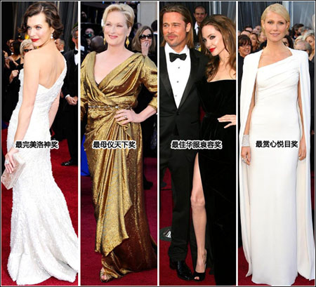 影后争艳红毯秀 大牌范混不吝奥斯卡是一项电影盛事,但红毯的可看度同样不输于颁奖典礼本身。小金人不是人人都能得到,但小编的时尚颁奖典礼则希望永不落空,各类奥斯卡红毯大奖花落谁家?让小编来一一揭晓。最完美洛神奖:米拉-乔沃维奇一身Elie Saab斜肩礼服配红唇,优雅内敛的装扮,再加上倾国倾城的回眸一笑,简直迷倒众生。最母仪天下奖:第84届奥斯卡红毯 梅丽尔-斯特里普金色Lanvin定制礼服配上金色高跟鞋和金色耳环,十足一“小金人”复活,这位夺得最多奥斯卡小金人的女星,早在人们刚明白什么是时尚时,就已经开始扮起了女神,而现在,当大家都在扮女神时,她已经开始扮起了“太后”。最佳华服衰容奖:这个奖要分两部分,最佳华服是颁给安吉丽娜朱莉的,而最衰容奖则是颁给布拉德皮特。这两位最耀眼的明星伴侣驳斥了"男人40一枝花,女人40豆腐渣"这句话,穿着Versace高叉礼服安吉丽娜朱莉气场强大美丽依旧,而一身标准西装配上中分油头大胡茬的皮特则是十足的大叔样。
