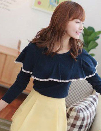 深色系的上衣,因为有荷叶领的注入,似乎让人感觉到了夏日池塘,轻风拂动大片荷叶的意境呢?搭配淡黄色系的高腰裙,让色彩更加融和。层次感高腰裙,在腰部起到了瘦腰的效果,整体造型呈现出的知性范,很适合OL们。