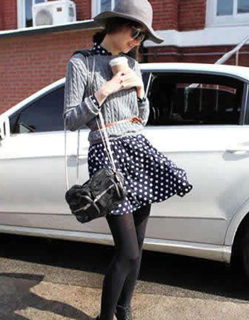 连衣裙在这个时候要巧妙搭配哦!深蓝色波点连衣裙,古着味道中透着可爱,烟灰色毛衫套入,加入腰带装饰和宽檐帽,仿佛赫本年代哦!你也可以罗马假日去了!美赞!