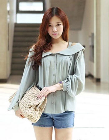 象征着春天的薄荷绿,清凉而又显得非常的有仙女气息!娃娃领的设计本是甜美,但是露肩的设计更是增添了几份小性感在内!竖排的透明纽扣让小编想起了学生时代!宽松舒适的面料很是喜爱,搭配热裤或者是白色小脚裤都会让你气场不凡哦!