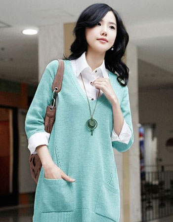 宽松的长款针织衫,浅绿色清新淡雅,充满了淑女的味道。v领款式,内搭白色衬衫特别好看。下身可以随意的搭配牛仔裤,高跟鞋,做个美丽女子吧。