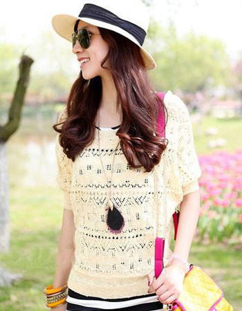 短袖镂空针织衫,清新淡雅的米黄色,有种小清新的味道。宽松的版型很适合上身较胖的女生,内搭黑白条纹连衣裙,清爽利落,简约有型。