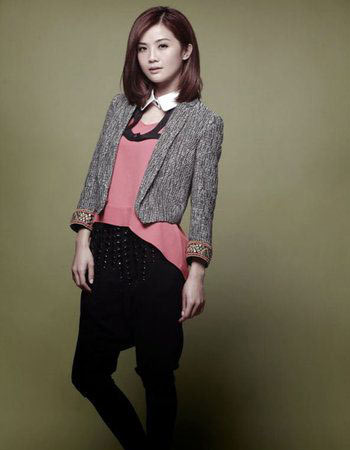 灰色小西装短款的设计很适合娇小的阿Sa,搭配红色不规则打底衫和哈伦裤,潮到爆!