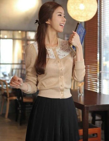 淑女的针织小开衫,淡淡的咖啡色,有种小清新的味道,肩部采用镂空蕾丝装饰,小小的泡泡袖很显瘦哦。下穿黑色百褶短裙,配上高跟鞋,特别淑女。