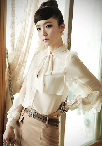 设计细节非常好看,小立领,突破传统的设计,前面长出来可以打一个蝴蝶结,非常有女人味,袖口荷叶边装饰和前片上层装饰连接得非常自然和谐。更显整件衬衣的精致和高档。