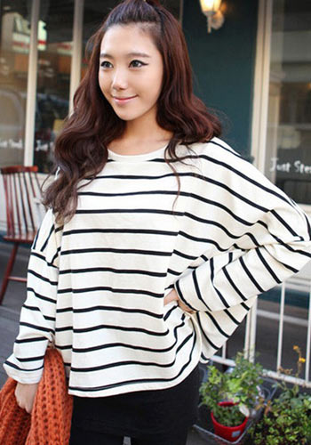 条纹款式穿着很自然美观哦,蝙蝠袖设计很时尚哦,圆领剪裁很优雅哦。