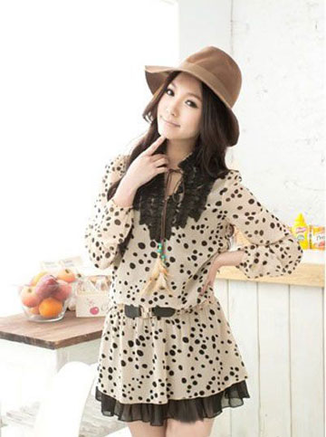 春夏季节大热的服饰面料莫过于波点和蕾丝了。这款将雪纺衫上打造出来了许许多多的波点,好像有给人一种复古的味道!接近肤色的裸色,远远看去有点像豹纹一样的性感呢,裙摆的特别设计和胸襟前相得益彰,塑造潮流新形象!