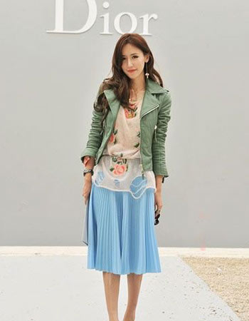 绿色小皮衣外套搭配印花雪纺衫,下身穿浅蓝色百褶半身裙,色彩明丽,清新迷人特别美。脚上穿绿色的高跟鞋,色彩搭配相得映彰哦。