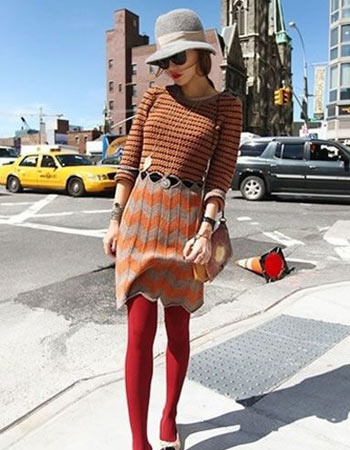 条纹感针织毛衣搭配波浪纹半身裙,上下都是条纹的设计,特别精致大气,也很显瘦。选择红色的裤袜和平底鞋来搭配,简约时尚。