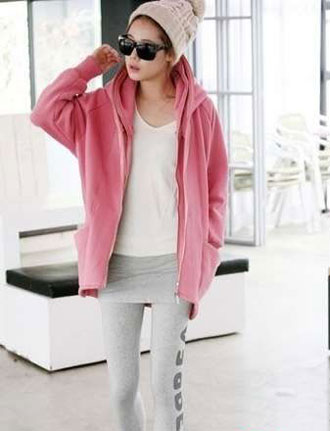 粉色宽松连帽卫衣看起来十分休闲可爱,搭配上纯白色内搭,下配灰色紧身裙和leggin。整身搭配看起来十分休闲随意,一定淡粉色毛线帽更是将少女的活泼气息表现出来。