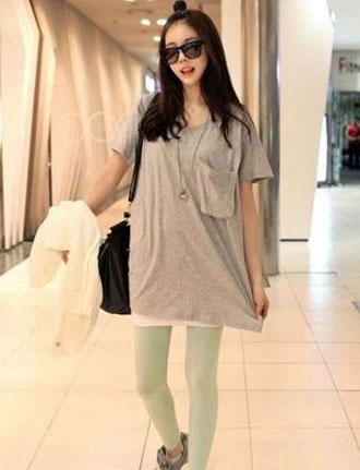 淡灰色宽松Tee搭配一条薄荷绿色legging,一双现在韩国大热的运动鞋。用帅气黑超来提升整身气场。