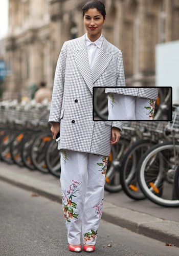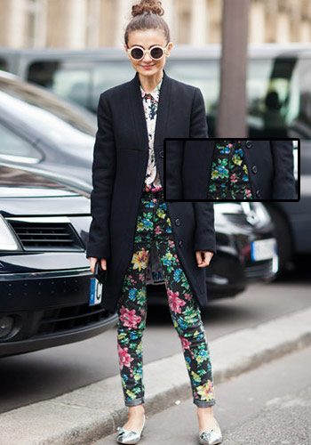 印花是春天里不能少的元素,而各种美美的印花不一定是热辣的专属品。这款裤子在整个黑色上点缀了五颜六色的小个花朵,虽然颜色俏丽,但黑色为底总是透着酷酷的感觉。加上麻豆的复古眼镜,相当Q哦。