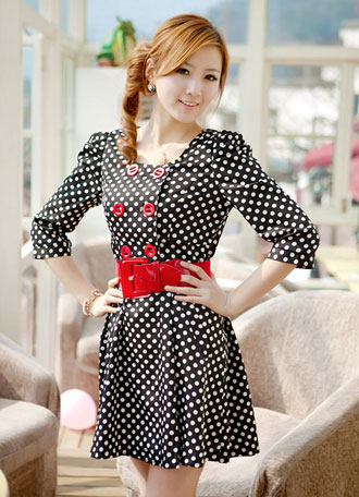 很漂亮的一款春裙,黑白圆点,双排扣设计,连衣裙最为抢眼的地方是红色腰带,与扣子相呼应,起到点睛作用,修身的款式很显瘦。