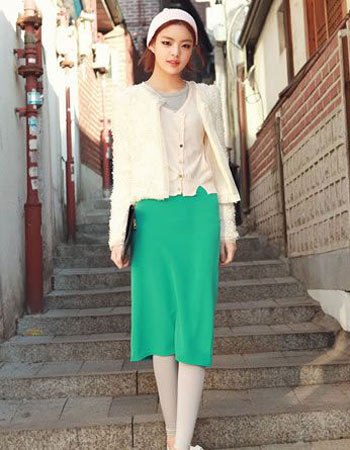 亮丽的诱惑绿点睛成为整体重点,上下都选择了浅色系作为承托搭配,烟灰色Tee舒适的作为内搭有运动休闲在其中,层次搭配的小毛衫和蝴蝶结平底鞋呼应,发带和手包起到好处。