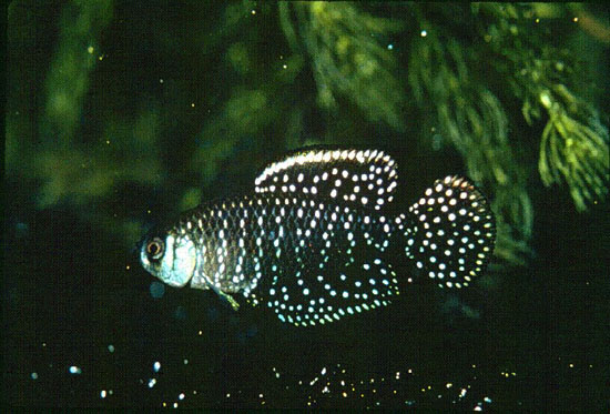 中文名:ALX鳉 英文名:Enter Rio Pearl Fish 学名:Cynolebias alexandri 分布:美洲 形体特征:体表上有斑点,但不太明显,而鱼鳍上的黄色、蓝色斑点就十分醒目,好像星辰一般动人。 水质要求:7.0-10°dGH 繁殖:困难 食物:活饵