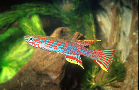 中文名:OGO鳉 英文名:Broken-Striped Killie 学名:Aphyosemion ogoense ogoense 分布:西非 形体特征:雄鱼非常多彩,但不同变异形态者,其色彩亦不相同。体色为深蓝色至蓝黄色调,上面通常有四排红色纵向斑纹。 水质要求:和同属鳉科鱼类似 繁殖:困难 食物:活饵