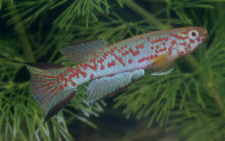 中文名:LAB鳉 英文名:Red-Streaked Killie 学名:Aphyosemion labarrei 分布:西非 形体特征:雄鱼色彩丰富,蓝白的基底色上常带有绿色调,其上有深红色斑纹分布。鳍部外缘是黑色。 水质要求:22-24℃ 繁殖:困难 食物:活饵