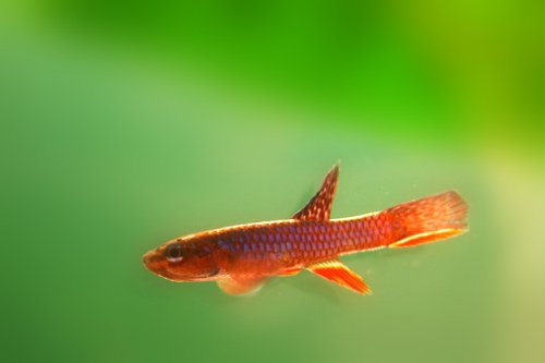 中文名:CEO鳉 英文名:Gery`s Jewel Killie 学名:Aphyosemion georgiae 分布:加彭 形体特征:橘褐色的体表上有着蓝色点纹,连鱼鳍上也散布着蓝色闪耀光泽,十分可爱,性情温和。 水质要求:和同属鱼种相同 繁殖:困难 食物:活饵