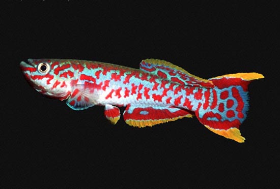 中文名:NIE鳉 英文名:Nigeria Steel-blue Killie 学名:Aphyosemion gardneri nigerianum 分布:奈及利亚 形体特征:雄鱼绿棕体色上有红色斑点分布。背鳍和臀鳍外缘为黄色,旁边还有一条红色横纹,尾鳍也是一样。 水质要求:22-25℃ 繁殖:困难 食物:活饵