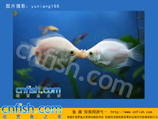 繁殖:同斗鱼类的繁殖方式不同。它不吐沫营巢,而直接产漂浮性卵,浮在水面。卵呈琥珀色,如发白,则说明卵未受精。产卵量较大,每次4000-10000粒。不挑不拣好养活接吻鱼游动起来十分缓慢,显得仪态万千,是极具观赏性的热带鱼。因为鱼体微红带白好似初放的桃花,所以还有很多行家叫它桃花鱼。接吻鱼很容易饲养,它对水质没有特殊要求,水温在22-26摄氏度之间就可以,很多学生在宿舍里用小茶杯、小瓶子也养活了接吻鱼。但是由于接吻鱼长起来个头较大,建议最好选择大一点的饲养缸。接吻鱼性情温和,成群结伴在各个水层活动,可以与其他鱼混养。而且它食性杂,一点也不挑食,面包虫、碎蚯蚓、人工饲料,主人喂什么,它就吃什么。不但个头生长快,抵抗力也不错,很少生病。 开枝散叶儿孙多接吻鱼在人工饲养条件下没有固定的繁殖季节,而且繁殖较简单。接吻鱼15个月大的时候进入性成熟期,一年可繁殖多次。打算繁殖小鱼时,可按雌雄1:1的比例把亲鱼放入繁殖缸内,同时兑进一些蒸馏水,刺激亲鱼发情。每尾雌鱼的产卵过程要持续数小时,可产卵1000余粒,有的可达2000-3000粒。由于接吻鱼有吞吃鱼卵的习惯,所以繁殖缸里应该多种植一些浮性水草