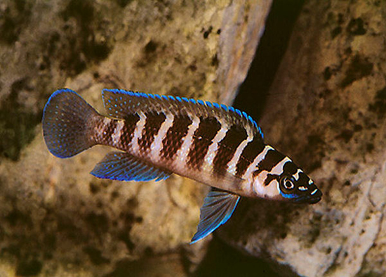 中文名:蓝九间 英文名:Terete Lamprologus 学名:Neolamprologus cylindricus 最大体长:11cm 水质:pH7.0-8.0 硬度:10.0-15.0°dGH 特征:优雅美丽的白色线条与茶褐色交杂,鱼鳍委员则闪耀着蓝色光泽 喂食:人工饲料活饵