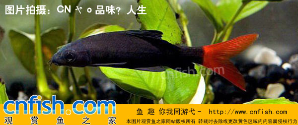 红尾黑鲨又名黑鳌鱼、红尾鱼、火尾鱼。来自泰国的红尾黑鳌在热带鱼中算是中型偏大的品种,它体长可达 14 厘米,身体呈纺锤形,尾鳍叉形,全身为黑墨色,尾鳍呈金红色。红与黑置于一体,色彩分明,别具一格。红尾黑鲨的另一标志是背鳍特别宽大,嘴上有二根胡须。