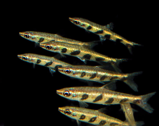 中文名:五点铅笔 英文名:Barred Pencilfish 学名:Nannostomus espei 分布:盖亚纳 形体特征:体侧上有5个斜型的暗褐大型斑点,是非常珍贵的品种,体长最大可达5公分。性情温和。 水质要求:22-27℃的水温和弱酸性至中性的水质 繁殖:可以人工繁殖 食物:人工饲料或活饵