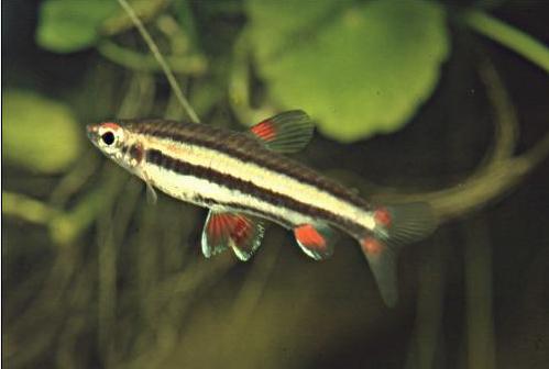 中文名:三线红铅笔 英文名:Three-lined Pencilfish 学名:Nannostomus trifasciatus 分布:巴西 形体特征:体侧有三条细长的黑色纵纹,除胸鳍外,各鱼鳍的中央与纵纹之间都有红斑分布,性情温和的群居鱼。 水质要求:和同类鱼种相似 繁殖:困难 食物:人工饲料或活饵