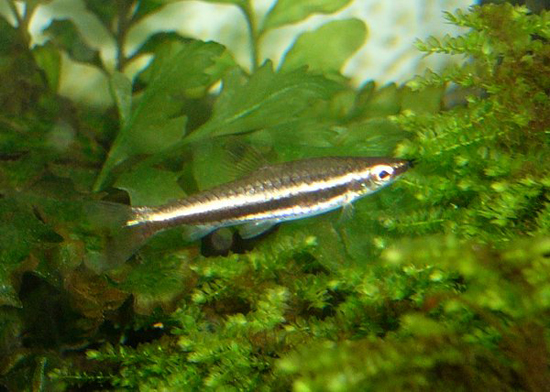 中文名:两线铅笔 英文名:Tow-lined Pencilfish 学名:Nannostomus bifasciatus, 分布:苏利南、盖亚纳、马德拉河 形体特征:体型细长,有两条黑色直条纹,尾柄上有一个红色斑点。性情温和,动作迟钝,最好群体饲养在茂密的水草水族箱中。 水质要求:23-27℃,弱酸性软水 繁殖:困难 食物:人工饲料或活饵