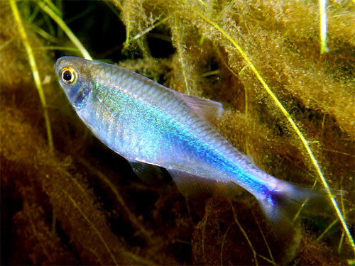 中文名:蓝刚果灯 英文名:Cochu`s Blue Tetra 学名:Boehlkea fredcochui 分布:秘鲁 形体特征:从体侧中央到尾柄处有一条明亮的青紫色纵纹。3公分一下的幼鱼,其体表上的青紫色纹非常明显;不过成鱼的青紫色彩就会较为淡化。性情温和,属群游性鱼种。 水质要求:弱酸性水质pH5.5-7.5,硬度15°dGH。 繁殖:困难 食物:人工饲料或活饵