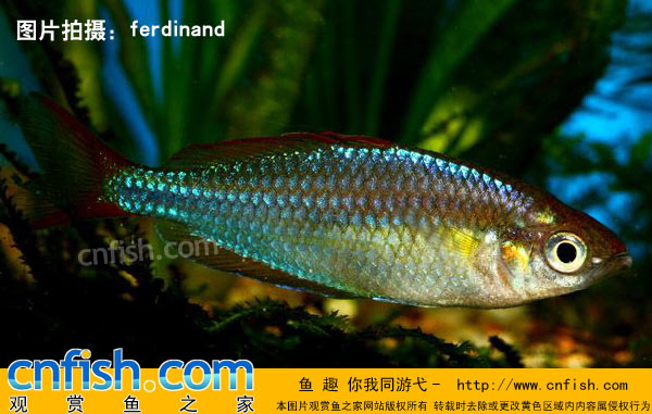 又名小彩虹,原产地澳洲,属虹银汉鱼科。体长5-6cm ,纺锥形。背鳍分为前后两个,背鳍、臀鳍上下对称,鳍条低矮等宽似带状。体色淡黄绿色,体侧有数条点状粉红色纵线。鳃盖上有一个红色圆斑,背鳍、臀鳍鲜红色,尾鳍但红色。鱼体周边镶着红边,在光线照射下犹如一个泛着红光的蓝色幽灵,非常美丽。