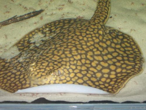 中文名:巨型龟甲魟 英文名:Short-tailed River Stingray 学名:Potamotrygon brachyura 由本种的英文名称「Short-tailed river stingray」(意指:短尾的河魟),就不难想像本种的外型,在淡水魟鱼里巨型龟甲魟的硕大体形可称得上是属一属二,一般身长可达95cm(生活在大自然中的个体直径甚至可长达2公尺)。相较於巨大的身形,比体盘直径还要短的尾巴,就更显得其短小了,故又短又粗的尾部可说是辨识巨型龟甲魟的明显特徵之一