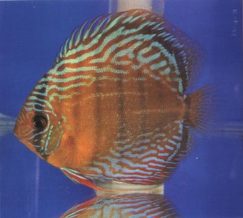产于南美玛卡普鲁湖的野生蓝七彩神仙,台湾中部繁殖场独具慧眼,挑选出这尾以红橙色为基底色,像粉刷一般一抹划过体表中央部分的美丽鱼种,靠近鱼鳍的上下部分则缀有蓝绿色的亮丽条纹,拥有典型的皇室蓝七彩神仙的条纹,使它整体看来十分具有野性美。