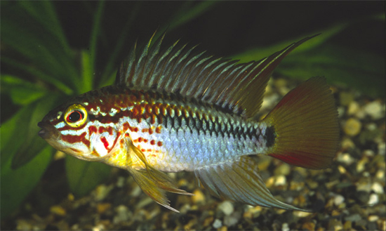 中文名:两点红短鲷 英文名:Villavicencio Dwarf Cichlid 学名:Apistogramma macmasteri