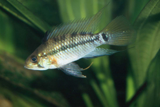 中文名:一线短鲷 英文名:不详 学名:Apistogramma amoenus 大量分布在亚马逊河水流域,体表上那条贯穿体轴的纵纹十分清晰醒目,尤其是成熟雄鱼的鱼鳃上有蓝色与红色混杂的斑点。饲育及繁殖较易,受短鲷入门者欢迎,雄鱼可达7cm,母鱼5cm。