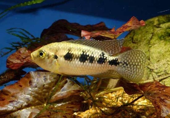 原产地非洲西部,属慈鲷科。体长10-12cm ,椭圆形 ,体黄褐色,从眼睛到尾柄有一条黑色纵带,体侧有数条暗黑色垂直环带,隐约可见。饲养水温22-26℃,水质中性软水。饵料有鱼虫、颗粒饲料等。繁殖水温27-28摄氏度,雄鱼体色鲜艳,雌鱼腹部膨大,属花盆卵生鱼类。雌鱼每次产卵300-500粒。