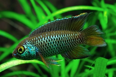 分布于吉贝拉附近的圆形体形短鲷,体色随颇为朴素呈暗褐色,但十分可爱,尤其是成熟雄鱼的体色会成金属光泽般的浓绿色,且闪耀着金色光芒,配上金黄闪闪的眼睛,使人感觉对比强烈。饲养容易,只需要45公分的水族箱即可。喜欢弱酸性至中性软水,最好在水族箱内摆设些沉木和水草供他们躲避。肉食性,水温在22~25度之间。体长可达7公分。