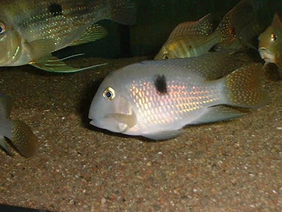 分布鱼南美洲的圭亚那、巴西等地,属慈鲷科,体长10-12cm,椭圆形。体灰黄色,体表密布蓝色圆点,头部有蓝色花纹,体侧身体中央有一个暗黑色圆斑,背鳍有蓝色花纹,尾鳍有蓝色花纹,边缘黄色。饲养水温22-26℃,水质是弱酸性软水。亲鱼自行配对,一鱼一缸,属花盆卵生鱼类。