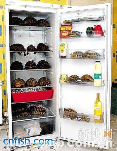 上周六,雪莉家里来了客人。客人打开冰箱找东西时,被一冰箱的乌龟吓得大嚷大叫。雪莉养的几只乌龟因为生病,目前仍然没有冬眠。下个月,雪莉将唤醒冰箱中的冬眠乌龟,并把它们转移到温室中生活。