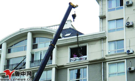 26日18:00许,记者在中润大道时代名都小区看到,一辆大吊车吊着很多建材往一栋11层高的楼上运。记者进一步了解得知,该栋楼11楼的住户买了一个大鱼缸,有3米多长。想用电梯运,但是电梯装不下,而通过楼梯往上运,难度也是非常大,又怕把鱼缸碰坏了,最终想起用吊车。记者看到11楼的住户将南面的整面窗户都拆下来,几个工人在楼下空地将鱼缸以及安装材料等物品用绳子捆紧,通过大吊车的长臂运到11楼的窗户处(如图)。楼上有几个人从屋里将东西接住卸下来,经过几次往返,鱼缸及建筑材料都运上去了。