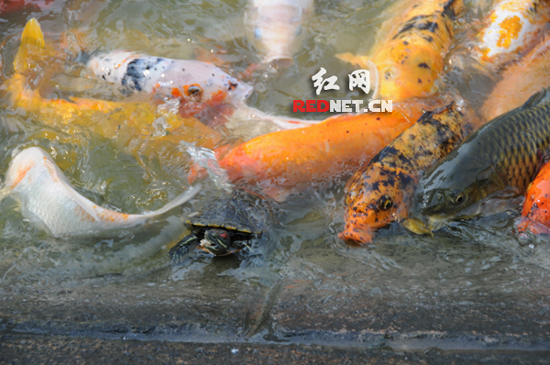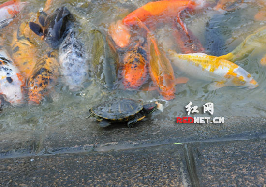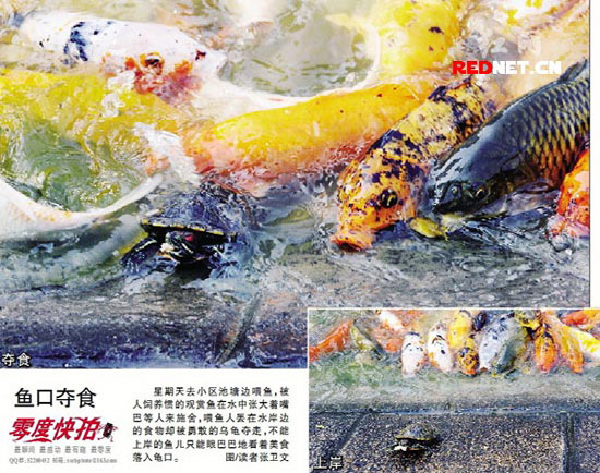 星期日,笔者在小区的池塘边喂鱼。被人饲养惯的观赏鱼在水中张大着嘴巴等人来施舍,丢在水岸边的食物被勇敢的乌龟夺走,不能上岸的鱼儿眼巴巴地看着美食落入龟口。