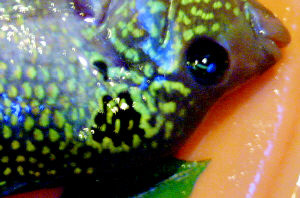 图为罗汉鱼鱼鳞上长有类似“绝”字的花纹。